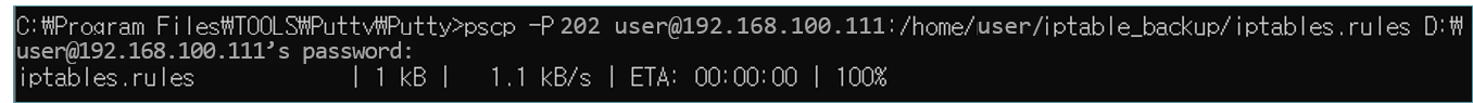 pscp -P 202 user@192.168.100.111:/home/user/iptable_backup/iptables.rules D:\