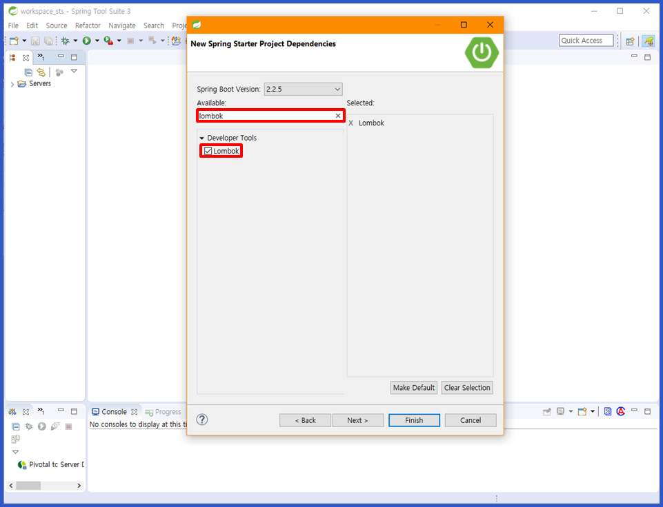 2. 생성할 프로젝트의 내용 입력 → Dependencies 단계에서 Available에 lombok 검색 및 결과 체크 → Finish