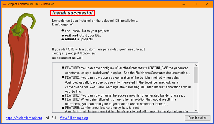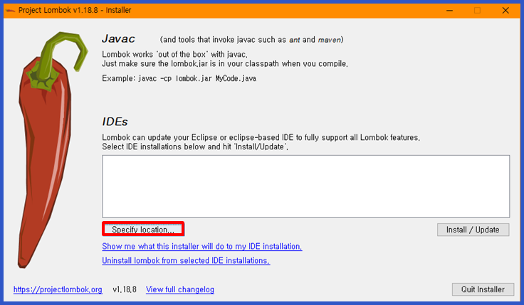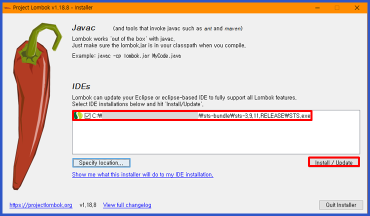 (lombok-1.18.8.jar 와 같이 버전이 있는 경우, java -jar lombok-1.18.8.jar)
