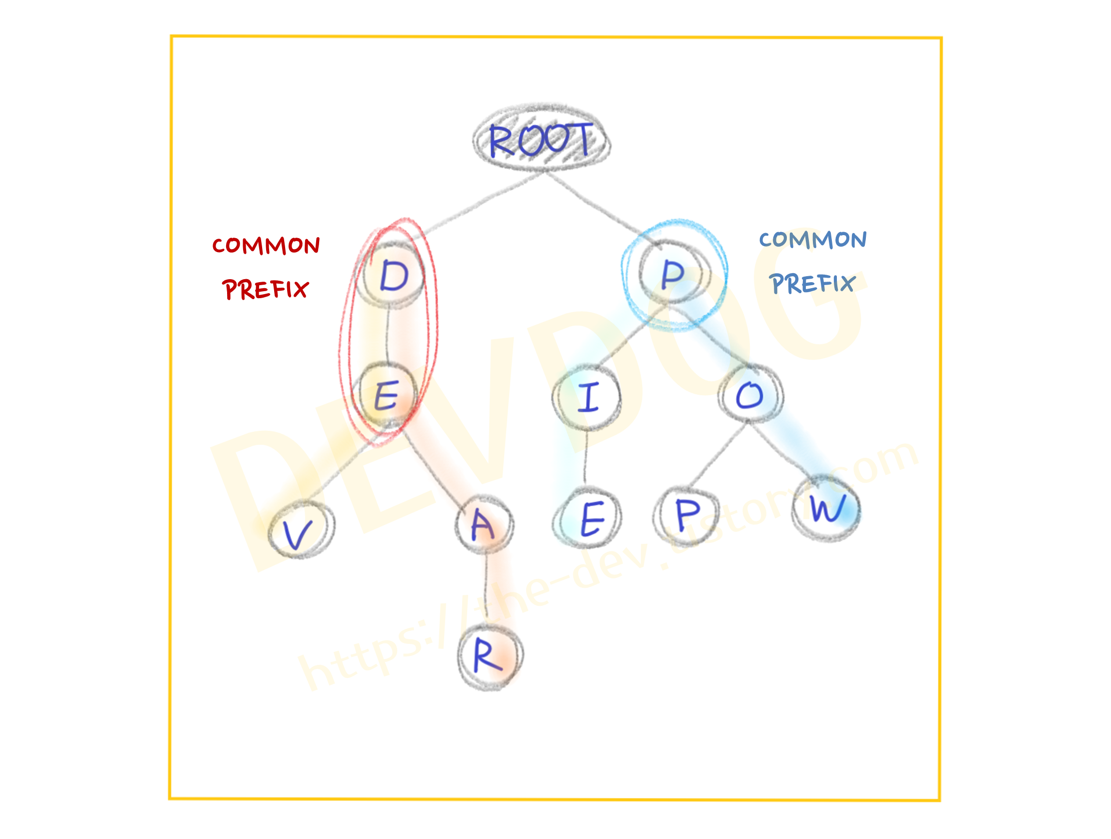 That is, 'DEAR' and 'DEV' which are the child nodes of 'DE' has 'DE-', and 'POW' and 'PIE' which are the child nodes of 'P' has 'P-' as a common prefix.