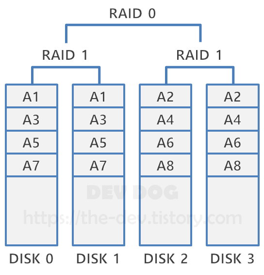 이 RAID-1 세트를 스트라이핑 기술을 사용하는 RAID-0으로 구성 - RAID-1보다 성능이 높고 가격이 비쌈