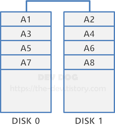 - 스트라이핑 기술(데이터를 여러 디스크에 걸쳐 저장)을 이용하여 분산 저장
