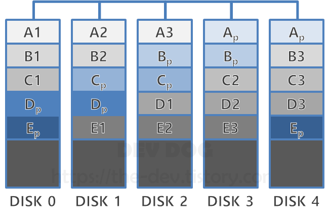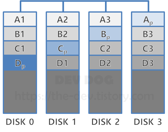 - 데이터 쓸 때마다 패리티 디스크도 접근하므로 쓰기 성능이 좋지 않음