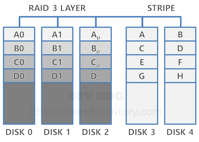 - 비트(bit)레벨의 스트라이핑 기술을 이용하여 최소 3개의 디스크에 데이터 분산 저장