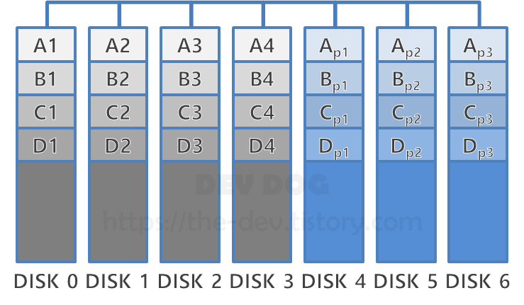 - RAID-5와 유사하나 2차 패리티가 포함됨 (2개의 디스크 오류에 대처 가능)