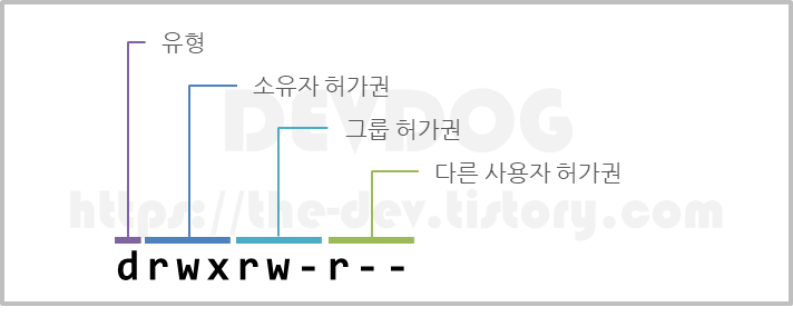 | r | 읽기 권한(4). 파일 내용 확인, 복사. 디렉터리 조회. |