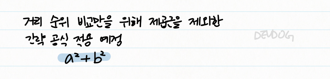 본 풀이에서는 거리 순위에 영향을 주지 않으면서 계산을 더욱 간소화 하기 위해 제곱근을 제외하고 비교했다.