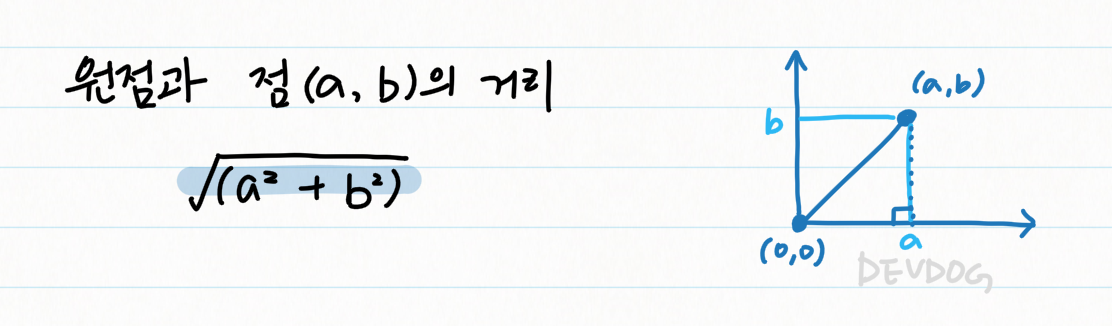 이 때, 두 점 중 하나는 원점이므로, 식은 다음과 같이 간략화 할 수 있다.
