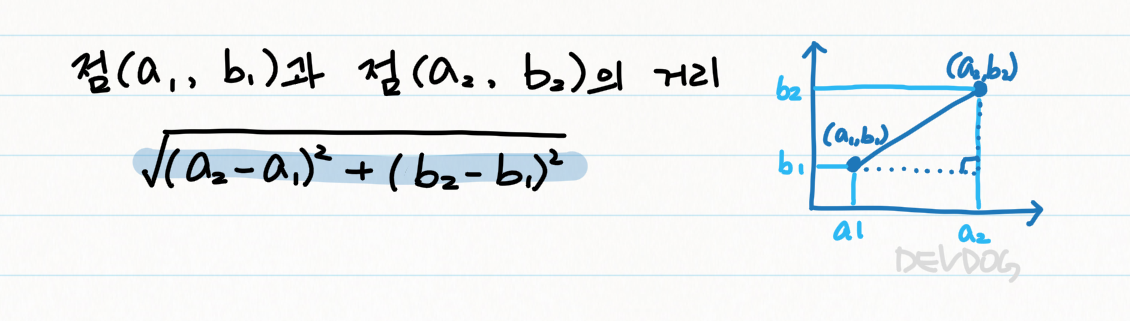 피타고라스의 정리에 따라 좌표평면에서 두 점 사이의 거리를 구하는 공식은 다음과 같다.