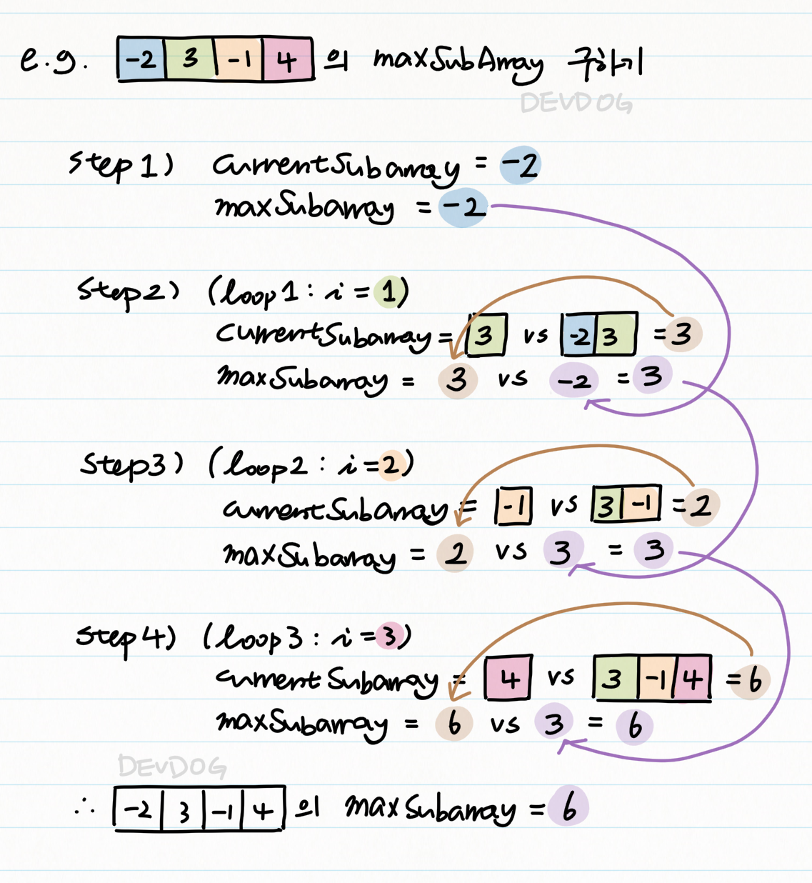 - "현재 인덱스의 값"과 "지난 서브 배열 + 현재 인덱스의 값" 중 무엇이 더 큰지 비교한다.