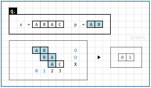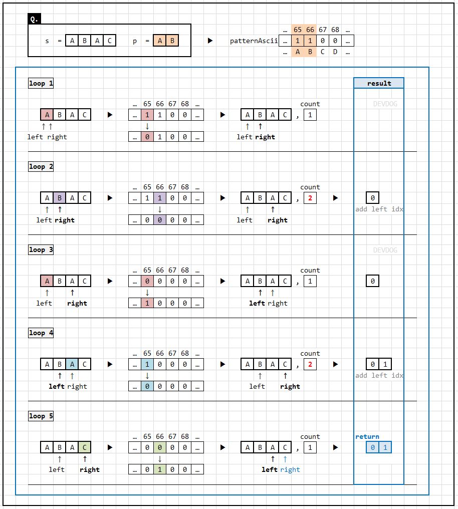 (없는 패턴의 배열값을 증가시키더라도 count가 줄기 때문에 매치되지 않는 것으로 치부된다.) - count가 패턴길이와 같아지면 그 때의 왼쪽 포인터를 결과 리스트에 추가한다.