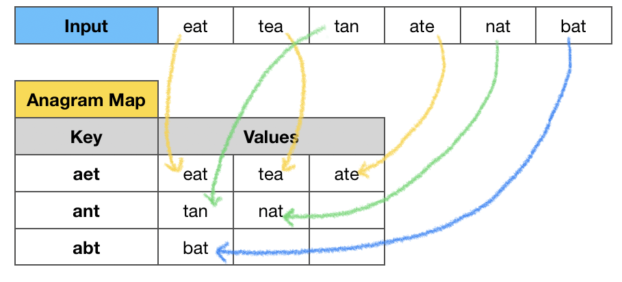 Output: [["bat"],["nat","tan"],["ate","eat","tea"]]