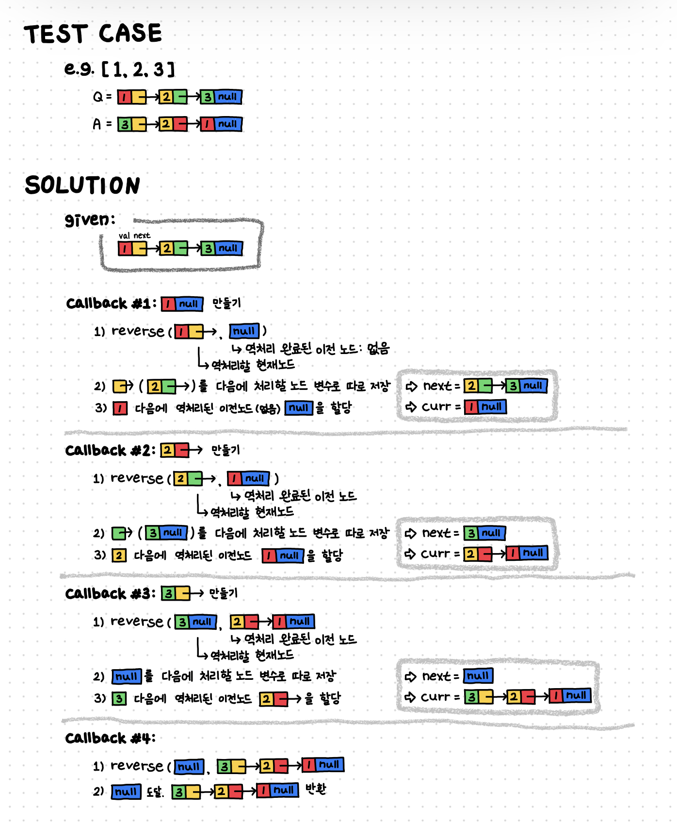 재귀함수를 이용해 연결리스트의 역을 구하는 방법이다.